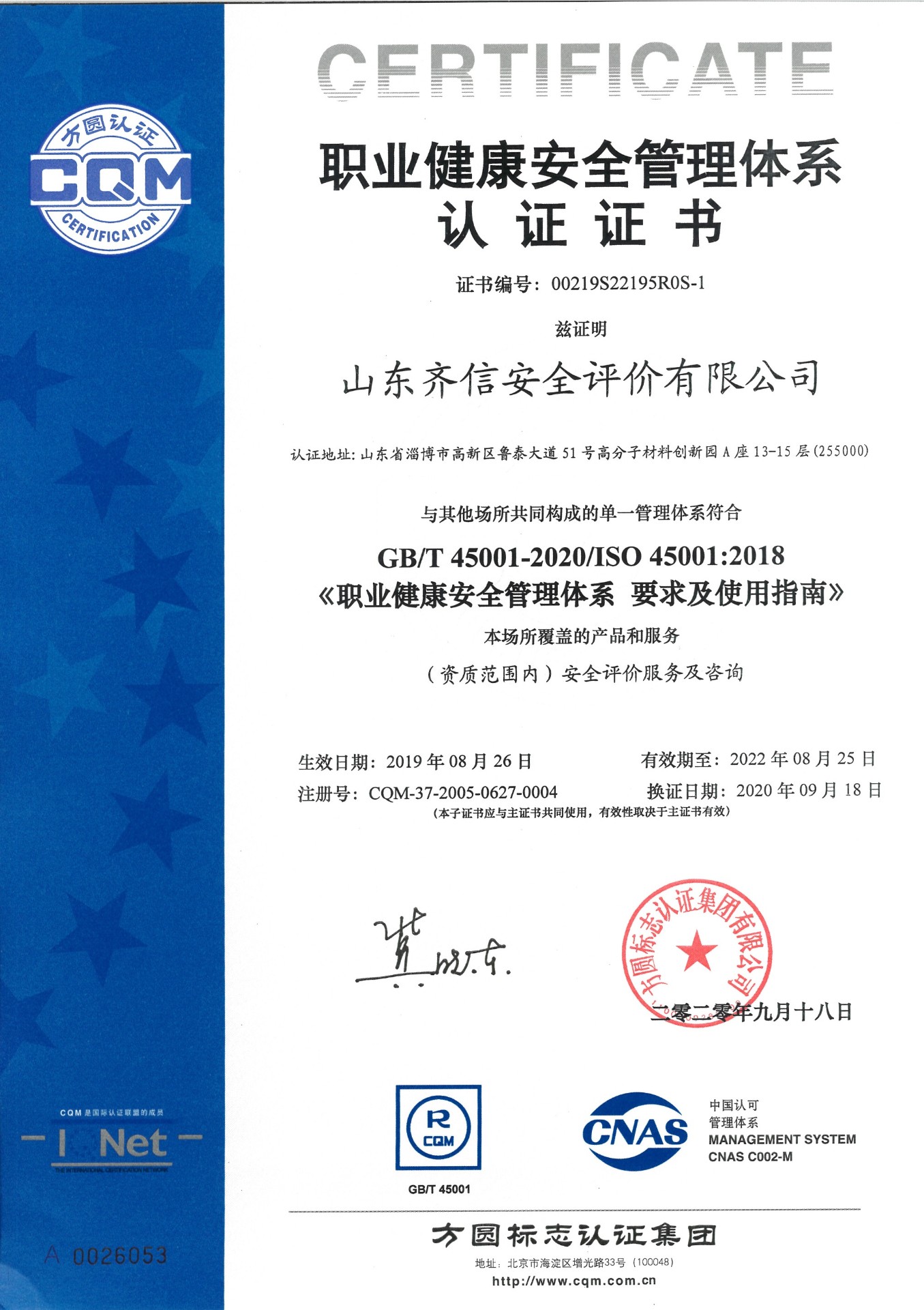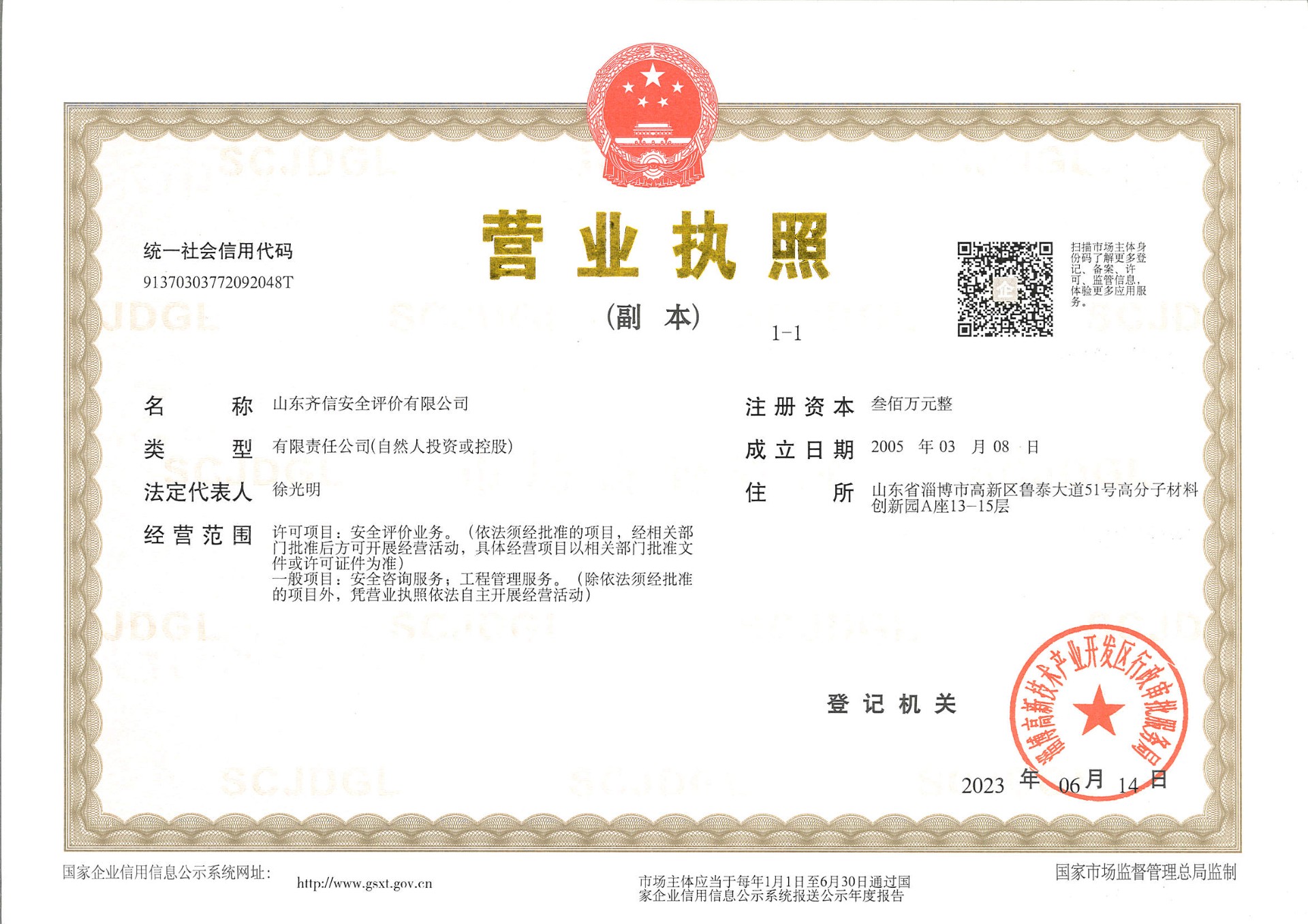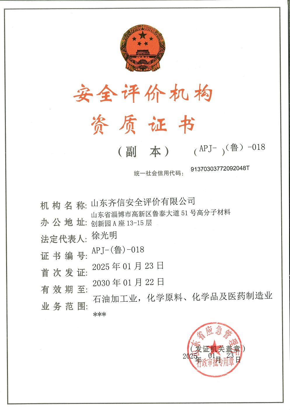 山東齊信安全評價(jià)有限公司成立于2005年3月,注冊資本300萬元人民幣,固定資產(chǎn)總值804.8728萬元。法定代表人徐光明,注冊地址及辦公地址位于淄博高新區(qū)魯泰大道51號高分子材料創(chuàng)新園A座13-15樓。2005年9月取得安全評價(jià)機(jī)構(gòu)乙級資質(zhì)。自國家應(yīng)急部1號令實(shí)施以來,公司于2020年1月15日取得新安全評價(jià)資質(zhì),業(yè)務(wù)范圍包括:陸上油氣管道運(yùn)輸業(yè);石油加工業(yè),化學(xué)原料、化學(xué)品及醫(yī)藥制造業(yè);金屬冶煉。2018年12月21日取得安全生產(chǎn)標(biāo)準(zhǔn)化二級評審單位,評審范圍:危險(xiǎn)化學(xué)品、紡織、建材、輕工、冶金、機(jī)械。 公司現(xiàn)有人員41人,其中專職安全評價(jià)師37人,注冊安全工程師26人,研究員1人、碩士5人、雙學(xué)士1人,山東省安全專家?guī)鞂<?人、教授級高工1人,高級工程師8人、工程師22人,專職危險(xiǎn)化學(xué)品標(biāo)準(zhǔn)化評審員、工商貿(mào)標(biāo)準(zhǔn)化評審員30人,本科以上學(xué)
